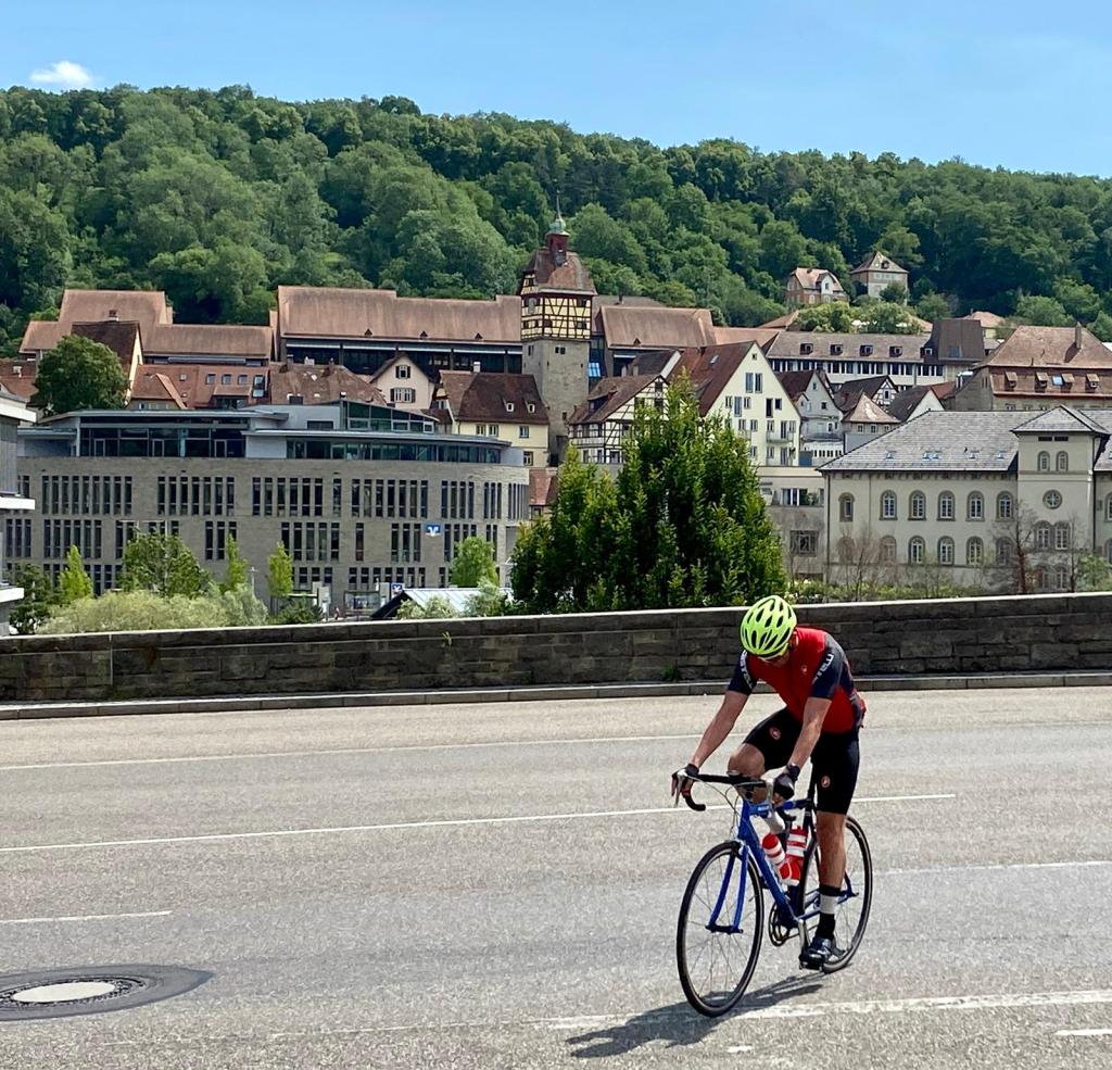 Als es dann „endlich“ weiter ging, setzte auch etwas Regen ein. Zum Glück war er nicht ganz so stark. So war er eine angenehme Abkühlung. Nach nicht mal 30 min war es dann auch schon wieder trocken. Bei Kochertürn war ich dann von der Navigation meines Radcomputers so genervt, dass ich mich von da an komplett von meinem Papa lenken gelassen habe. So musste ich zwar teilweise stärker befahrene Straßen benutzen. Das war aber psychisch leichter zu verkraften als ständig falsch abzubiegen. Durch die Kurorte Bad Wimpfen und Bad Rappenau ging es dann durch den nördlichen Kraichgau in Richtung Neckargemünd. Bei Helmstadt-Bargen wartete dann ein Tross meines Heimatvereins LLG Wonnegau um mich auf den letzten 90 km zu begleiten. Über ein paar knackige Anstiege mit bis zu 15% Steigung ging es dann zum letzten geplanten Stopp bei Dilsberg. Von da aus waren es noch ca. 75 km bis Westhofen. Ein Teil meiner besten Freunde wartete dort zusammen mit meiner Mutter. Das sollte der Anfang eines ereignisreichen und emotionalen letzten Streckenabschnitts werden.