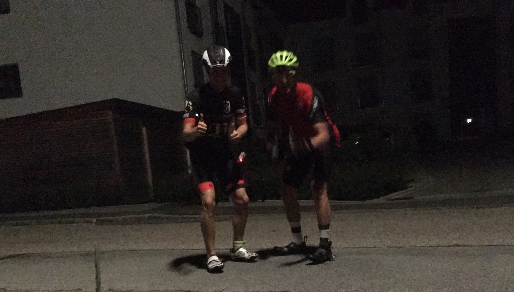 Bereits am Freitag war alles bereit zur Abfahrt. Schließlich solle es ja schon nachts um 3 Uhr los gehen. Der Wecker klingelte nach etwa vier Stunden Schlaf um 2 Uhr. Einen Kaffee und eine Nussecke gabs zum „Frühstück“. Danach habe ich mich fertig für die Fahrt gemacht. Neben der Gesäßcreme habe ich darauf geachtet, dass die Radkleidung von Anfang an gut sitzt. Um 2:45 Uhr ging es vor die Tür. Daniel vom TSV Jahn Freising war schon da. Er begleitete mich auf dem ersten Drittel. Radcomputer angemacht und die Tour laden lassen. Zwischenzeitlich in der Dunkelheit irgendwie ein Foto vor der Abfahrt gemacht, um das Ganze auch festzuhalten.