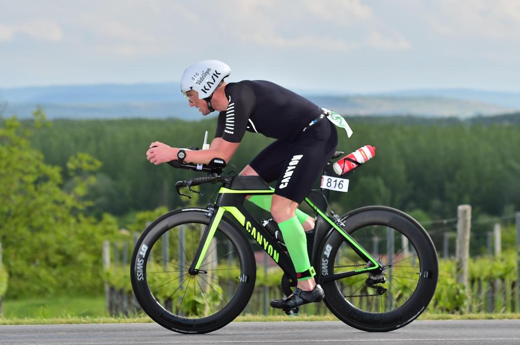 Ich fand dann doch schnell ins Radfahren rein und konnte meine Werte treten sowie meine Strategie umsetzen: erstmal Obergrenze der Vorgabe ballern. Als es dann nach ein paar KM auf ein abgesperrtes Stück der S33 ging, ballerte ich erst so richtig los. Als es nach 20,8 km Gesamtstrecke von der Autobahn abging fuhr ich über eine Zeitnahme und ich hatte schon den 429. Gesamtrang also innerhalb der kurzen Distanz sage und schreibe „272“ Plätze gut gemacht. Kurz danach ging es in den ersten richtigen Anstieg des Tages relativ kurz, aber dafür steil. Das nutzte ich sofort, um mein Trinksystem mit der Flasche hinterm Sattel aufzufüllen, dass ich in der nächsten Flachpassage in Aeroposition bleiben konnte. Obwohl in den Anstieg sehr kontrolliert gefahren bin, machte ich weiter Plätze gut. Oben angekommen ging es in eine sehr technische Abfahrt und es war teilweise Harakiri, weil ich auch da weitere Athleten überholt hatte, was aber nicht in jedem Teilstück der Abfahrt ohne weiteres möglich war. Dann ging es über 20 km an der Donau entlang gen Westen. Es zog sich wie ein roter Faden durch die zweite Disziplin: Ich war entweder allein unterwegs oder überholte Athlet für Athlet. Von hinten kam auch zu keiner Zeit jemand, was doch irgendwie sehr krass war so gar nicht überholt zu werden. Nach 60 km Radstrecke kam dann der zweite und mit über 8 km längste Anstieg des Tages. Hier galt es für mich wieder kontrolliert nach oben zu fahren, um keine unnötigen Körner zu verschwenden. Kurz vor der Abfahrt tauschte ich dann noch eine Flasche an der Verpflegungsstation bevor ich mich mit teilweise über 70 km/h in die Abfahrt stürzte. Das Athleten sammeln tat auch hier keinen Abbruch und Passagen mit 14% Gefälle und teilweise ekligen Kurven machten mir das Überholen nicht immer leicht, sodass ich auch in dieser Abfahrt sicherlich etwas Zeit liegen lassen musste. Kurz vor Ende des Radsplits bekam ich dann doch wieder diese besch**** Beinkrämpfe und es fiel mir schwer aus den Radschuhen rauszukommen. Mit einer Radzeit von 2:33:49 fuhr ich die 216. Radzeit des Tages (von über 1100 Startern), womit ich zumindest bei den Profifrauen gut dabei gewesen wäre.