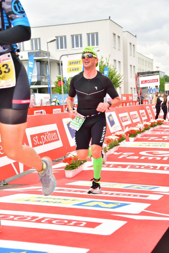 Der zweite Wechsel nicht der allerschnellste aber doch deutlich besser als der Erste. Dann ging es ab auf die Laufstrecke und meine Beine waren durch die Krämpfe doch etwas mitgenommen dennoch fand ich ein kontrolliertes Tempo, was im oberen Bereich der Pace Vorgabe lt. meiner GPS-Uhr war. Nach der ersten Runde fragte ich mich, ob ich es mit den muskulären Problemen schaffe das Tempo aufrecht zu halten. Aber konsequente Verpflegung mit Energiegels, Iso-Drinks und Salzkapseln brachten mich in einen Flow, wovon jeder Läufer träumt. Wenn du diesen Flow erreichst, läufst du wie ein Uhrwerk. Ich konnte das Tempo weder erhöhen noch wurde ich langsamer. Als dann mein Körper 2 km vor dem Ziel noch Glückshormone ausschüttete, habe ich mich nochmal richtig gepusht und lief mit einer 1:36:51 und einer Gesamtzeit von 5:04:44 Stunden überglücklich über die Ziellinie. Dort habe ich noch kurz den Moment genossen, bevor ich mir dann eine FFP2 Maske schnappte und den Zielbereich verlies.