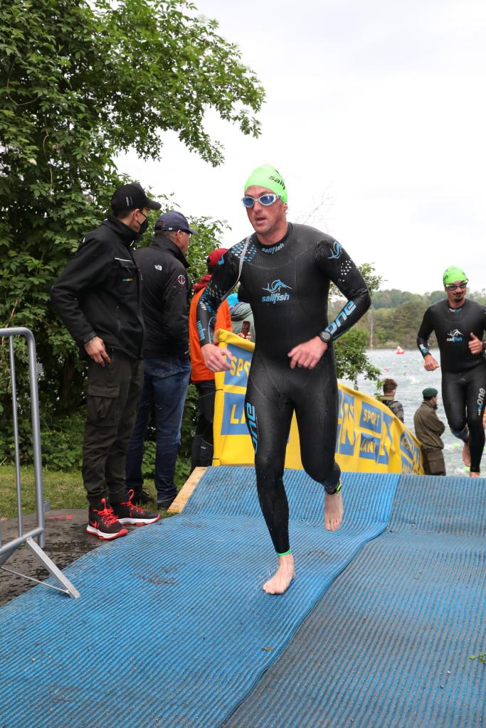 Es ist 3:30 als der Wecker klingelt. Corona bedingt wurden die Starts der einzelnen Wellen nach vorne verlegt, um das Starterfeld auseinander zu ziehen. Nach einer Mobilisation und einem kleinen Frühstück (wenn man das so nennen kann) ging es zur Wechselzone, wo die letzten Vorbereitungen getroffen wurden. Für mich bedeutete dies am Rad die Räder nochmal aufpumpen, die Verpflegung anzubringen, die Wattmessung zu kalibrieren und den Radcomputer einsatzbereit zu machen. Dann noch kurz die Profis beäugt ein paar Freunde und Bekannte begrüßt und die Laufverpflegung in den Beutel getan. Um lästige Blasen zu vermeiden, wurden noch Laufsocken und Radschuhe mit Babypuder präpariert und dann war es angerichtet. Danach hatte ich kurz Zeit mal innezuhalten und wurde echt ein wenig emotional. Es tat einfach so gut diese ganze Gemeinschaft zu sehen, wie sie ganz selbstverständlich ihrer Leidenschaft nachgingen – das hat einfach gefehlt. Danach wurden noch die Arme warm gemacht und mobilisiert und es ging in den Startblock mit Maske und Abstand. Über einen Steg ging es auf den See wo man innerhalb 2 Meter seine Maske in eine Tonne werfen und über eine Zeitmessmatte laufend in den See springen sollte. Es ging schon gut los, denn mir ist direkt die Schwimmbrille verrutscht und auch danach fand ich irgendwie so gar nicht in meinen Rhythmus. Der Rücken begann auf meiner Ausatemseite zu zwicken und das Wasser kam mir irgendwie sehr kalt vor – wenig verwunderlich bei 12 Grad Außen- und 15-16 Grad Wassertemperatur. Nach 900m ging es dann auf einen ca. 250m langen Landgang in den nächsten See.