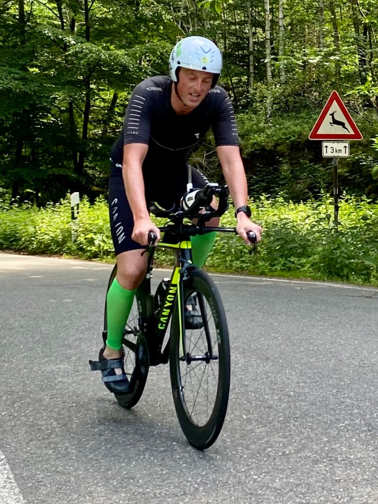 Irgendwie war es bei der morgendlichen „Hitze“ doch mehr Freude als Bange als das „Neo-Verbot“ verkündet wurde. So hatte ich wenigstens bis zum Wechsel aufs Rad mal angenehme Temperaturen. Die Schwimmstrecke ist dank Punkt zu Punkt mit der Neckarströmung (1,6km lt. Veranstalter) trotzdem sehr dankbar gewesen. Auf dem Rad ging es dann schon recht schnell zur Sache. Nach 1 km feinstem Asphalt ging es aufs Kopfsteinpflaster & direkt danach auf den 2-Rundenkurs hinauf zum Königsstuhl. Dank guter Übersetzung konnte ich eine recht hohe Trittfrequenz aufrechterhalten, sodass ich mich gut pacen & Kräfte für den Lauf aufsparen konnte. Die Abfahrt forderte allerdings mit teils >80km/h (lt. Strava sogar 90,9 in der Spitze) aber ebenfalls höchste Konzentration. In der 1. Runde wurde ich mal kurz von schattensuchenden Streckenposten + Polizei fehlgeleitet, was mir gefühlt eine Minute gekostet hat. Immerhin wusste ich dann in der 2. Rd wo ich lang fahren musste. Mit aktuell 5-6 Kg zu viel Fettmasse + einem „Panzer“ als Rennrad war ich zu schwer für diese Radstrecke (35km mit 900 Höhenmeter). So oft wurde ich glaube ich noch nie in einem Triathlon in der 2. Disziplin überholt. Spaß gemacht hats trotzdem. Nach dem 2. Wechsel ging es dann auf den 10km langen Laufkurs (Philosophenweg) mit knapp 200 Höhenmetern, die im Endeffekt komplett bis zum Wendepunkt gesammelt wurden. Dank gutem Körpergefühl konnte ich mich sehr gut pacen – auch wenn ich hierfür auch zu massig war. Die Laufstrecke war schön aber bergab wurde es so schnell, dass ich nicht viele Blicke nach rechts und links verschwenden konnte. Am Ende zeigte meine Aufzeichnung sogar eine neue 5km Bestzeit an. Etwas von den Strapazen gezeichnet aber glücklich lief ich dann auf der Neckarwiese über den Zielstrich.
